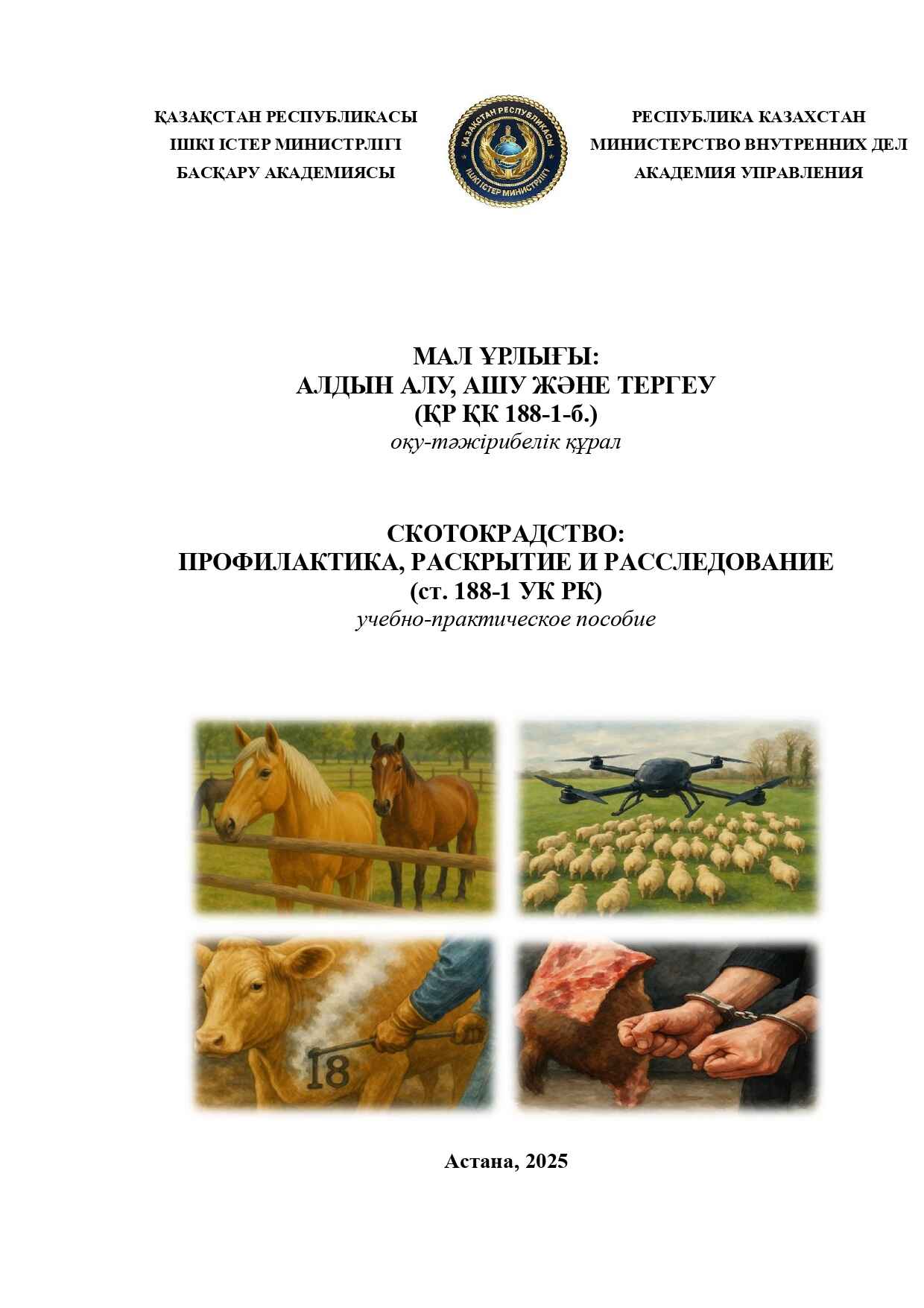 Учебно-практическое пособие по теме: «Профилактика, раскрытие и расследование скотокрадства: статья 181-1 УК Республики Казахстан» ISBN: 978-601-311-144-5.